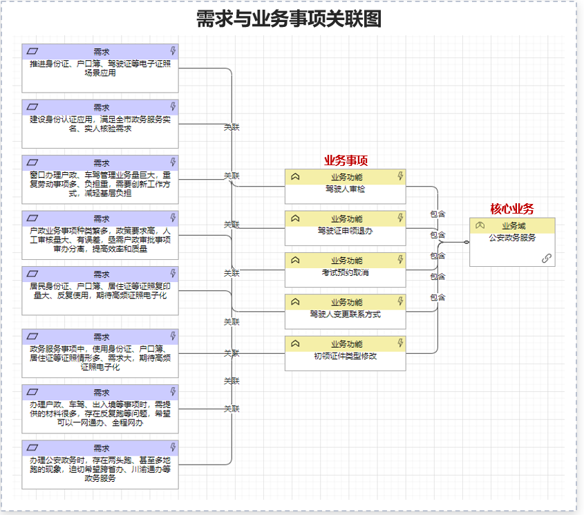 需求與業(yè)務(wù)事項(xiàng)關(guān)聯(lián):通過(guò)工具將重大需求關(guān)聯(lián)到核心業(yè)務(wù)及業(yè)務(wù)事項(xiàng)。定準(zhǔn)核心業(yè)務(wù)是“V”模型應(yīng)用的起點(diǎn),從需求出發(fā),謀劃多跨場(chǎng)景的第一步就是要找到場(chǎng)景所在的核心業(yè)務(wù)和事項(xiàng),自此開始對(duì)業(yè)務(wù)進(jìn)行多跨場(chǎng)景的拆解和集成。