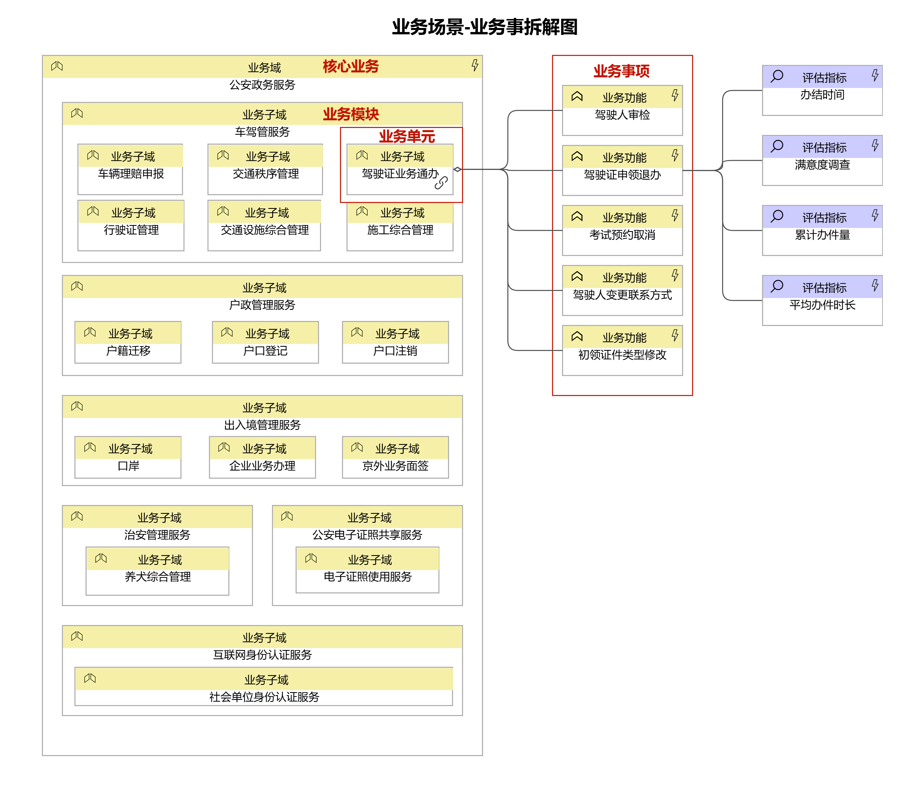 業(yè)務(wù)場(chǎng)景與事項(xiàng)拆解:從“大場(chǎng)景”中尋找“小切口”,對(duì)核心業(yè)務(wù)逐層拆解出業(yè)務(wù)場(chǎng)景、業(yè)務(wù)單元,直至最小級(jí)別的業(yè)務(wù)事項(xiàng)。最小級(jí)別的業(yè)務(wù)事項(xiàng)可以理解為單個(gè)部門履職具體化的最小單元,它關(guān)聯(lián)了主責(zé)部門、使用的數(shù)據(jù)等要素。對(duì)多個(gè)業(yè)務(wù)事項(xiàng)編排,形成解決特定業(yè)務(wù)需求的流程。因此,謀劃多跨協(xié)同場(chǎng)景需要將業(yè)務(wù)拆解到最小級(jí)別的業(yè)務(wù)事項(xiàng)才能滿足要求。