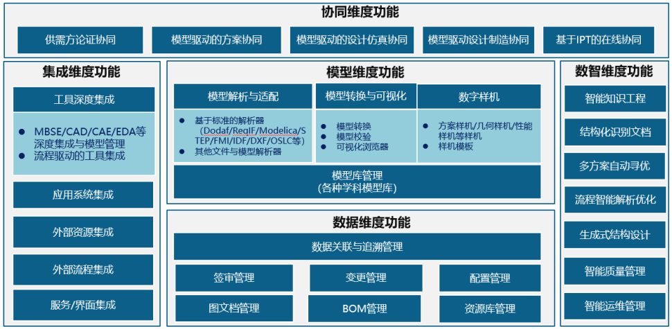 PLM系統(tǒng)能力構(gòu)成包括集成維度、數(shù)據(jù)維度、模型維度、協(xié)同維度和數(shù)智維度的功能集。