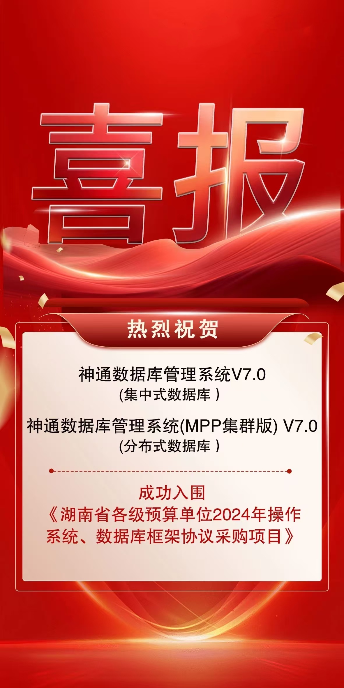 喜訊 神通數(shù)據(jù)庫入圍湖南省各級預算單位2024年操作系統(tǒng)、數(shù)據(jù)庫框架協(xié)議采購項目