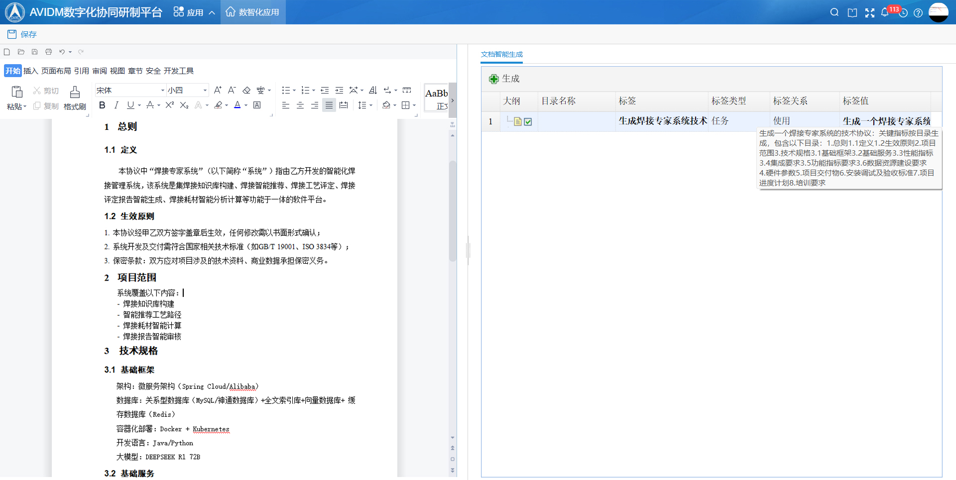 通過解析文檔模板與設(shè)計(jì)要求中的關(guān)鍵指標(biāo)和關(guān)鍵詞,調(diào)用DeepSeek大模型進(jìn)行語義分析,可結(jié)合科研生產(chǎn)的項(xiàng)目管理、體系論證、系統(tǒng)設(shè)計(jì)、工藝設(shè)計(jì)、生產(chǎn)制造、試驗(yàn)驗(yàn)證和運(yùn)維保障業(yè)務(wù)要求,基于歷史文檔庫的相似案例匹配,一鍵生成符合規(guī)范的技術(shù)文檔。