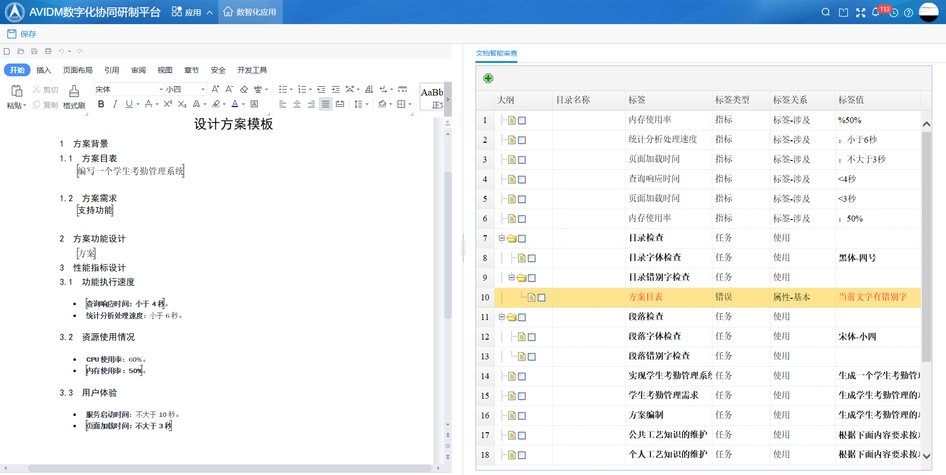 調(diào)用DeepSeek大模型的指標(biāo)抽取與分析能力, 通過在系統(tǒng)中內(nèi)置合規(guī)性規(guī)則庫(如結(jié)構(gòu)設(shè)計(jì)文件檢查規(guī)則、工藝設(shè)計(jì)文件檢查規(guī)則等),以及各種文檔模板的格式規(guī)范性要求,自動檢查文檔的格式規(guī)范性、內(nèi)容完整性和邏輯矛盾,支持多文件關(guān)聯(lián)審核。