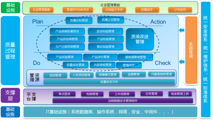 實(shí)現(xiàn)質(zhì)量業(yè)務(wù)流程的有效運(yùn)行: 通過基于流程的、電子化及網(wǎng)絡(luò)化的工作平臺(tái),實(shí)現(xiàn)質(zhì)量管理工作的動(dòng)態(tài)協(xié)同,提高質(zhì)量工作的規(guī)范性和工作效率,保證質(zhì)量管理體系的充分性、適宜性和持續(xù)有效性;實(shí)現(xiàn)質(zhì)量信息的有效整合: 實(shí)現(xiàn)信息化系統(tǒng)之間的無縫集成,改變質(zhì)量信息被割裂的現(xiàn)狀,消除信息孤島,保證質(zhì)量信息的完整性、關(guān)聯(lián)性和系統(tǒng)性,為質(zhì)量信息的有效應(yīng)用提供堅(jiān)實(shí)的保障;實(shí)現(xiàn)質(zhì)量信息的高效應(yīng)用: 借助信息化的優(yōu)勢,實(shí)現(xiàn)對質(zhì)量數(shù)據(jù)的全面采集、快速查詢、多維對分析、準(zhǔn)確追溯及靈活打包,充分挖掘數(shù)據(jù)價(jià)值,實(shí)現(xiàn)質(zhì)量數(shù)據(jù)應(yīng)用,保證質(zhì)量管理體系的持續(xù)有效性;實(shí)現(xiàn)產(chǎn)品全壽命周期的質(zhì)量控制: 利用計(jì)算機(jī)技術(shù),協(xié)助設(shè)計(jì)質(zhì)量、供方質(zhì)量、生產(chǎn)質(zhì)量及售后質(zhì)量管理,實(shí)現(xiàn)質(zhì)量信息的貫通和匯總,過程及質(zhì)量管理體系的持續(xù)改進(jìn)提供堅(jiān)實(shí)的數(shù)據(jù)保障;實(shí)現(xiàn)實(shí)時(shí)的質(zhì)量協(xié)同監(jiān)控和質(zhì)量決策: 通過質(zhì)量信息在企業(yè)各管理層之間的縱向貫通、傳遞和反饋,為企業(yè)高層領(lǐng)導(dǎo)提供質(zhì)量協(xié)同、監(jiān)控及決策手段,對影響質(zhì)量的關(guān)鍵因素的判讀及正確質(zhì)量決策的制定。